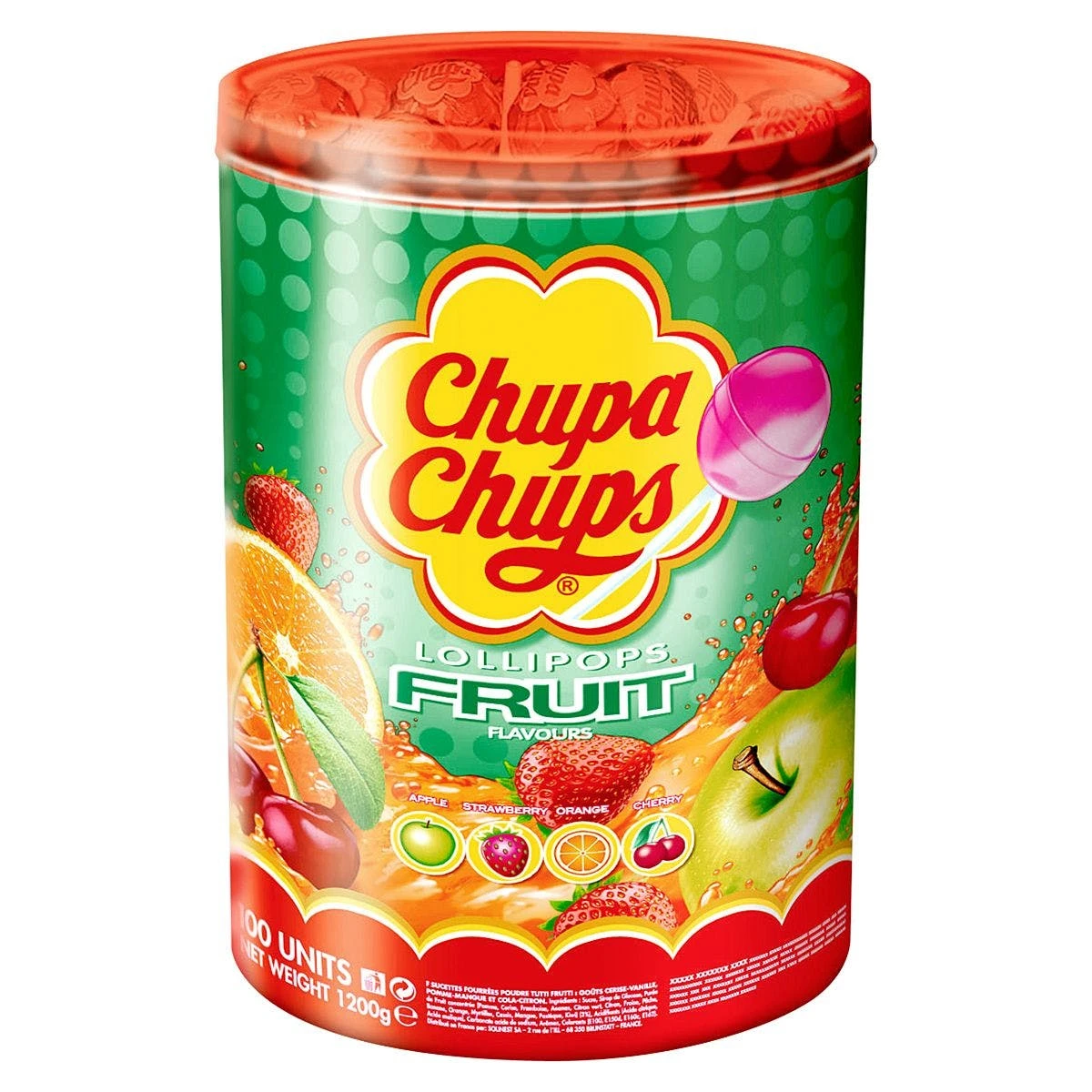 Die leckeren Chupa Chups Fruit in der Großpackung. Vier verschiedene Geschmacksrichtungen machen diese Süßwaren so beliebt: Lollies mit Apfel-, Erdbeer-, Orange- und Kirschgeschmack. In der praktischen Großpackung sind 100 Stk. enthalten. Bestens geeignet als Wurfmaterial für Karneval / Fasching