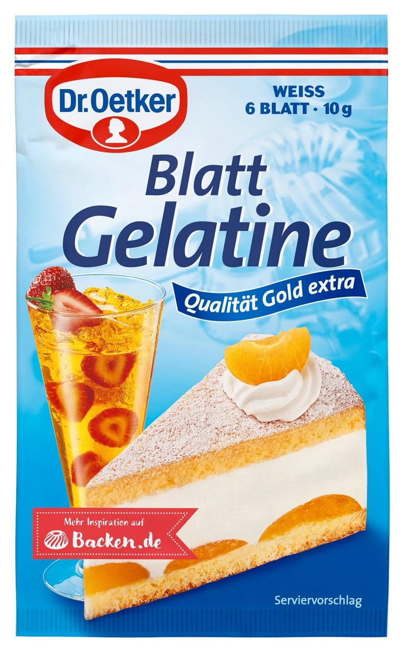 Der Backartikel eignet sich für feste Cremes Sahnetorten Gelees Sülzen oder z.B. eine Johannisbeer-Torte mit Marzipan. Durch das Blattformat lässt sich das Geliermittel gut portionieren und verspricht Gelinggarantie in allen Verwendungsmöglichkeiten.