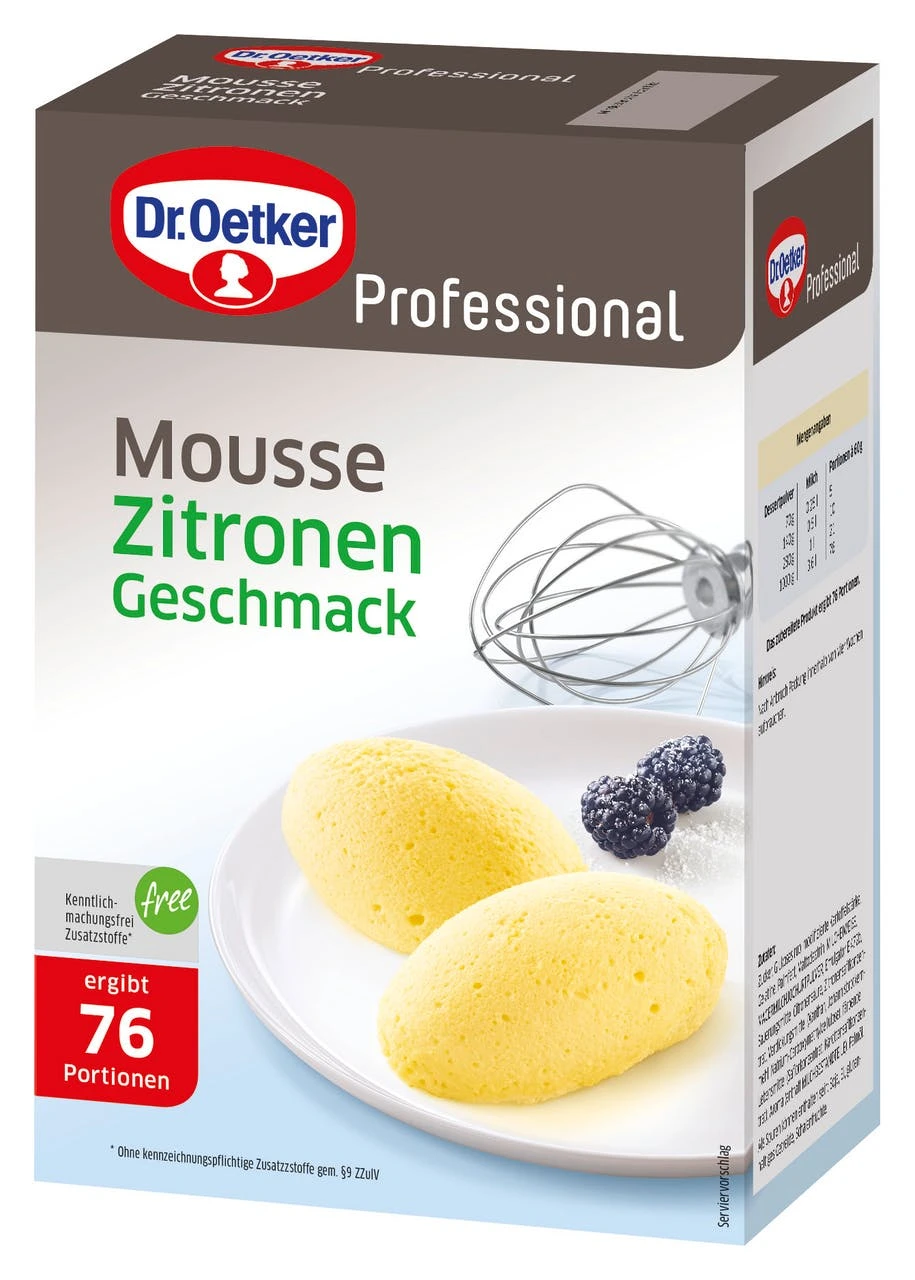 Eine fruchtige Mousse erhalten Sie mit dem Dessertpulver von Dr. Oetker Food-Service. Die Mousse mit Zitronen-Geschmack können Sie mit Milch und etwas flüssiger Sahne im Handumdrehen anrühren. Sie lässt sich ideal portionieren und sollte bis zum Servieren kalt gestellt werden. Für die Großpackung mit 1.000 g Inhalt benötigen Sie 3,5 l Flüssigkeit.