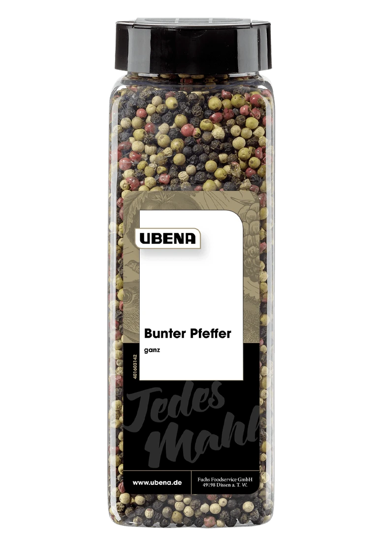 Bunter Pfeffer ist eine Mischung aus grünem, weißem und schwarzen Pfeffer, sowie rosa Beeren. Vielen ist nicht bekannt, dass weißer, schwarzer und grüner Pfeffer von der gleichen Pflanze stammen. Der einzige Unterschied ist die Erntezeit oder die Verarbeitung. Grüner Pfeffer wird unreif geerntet und getrocknet und hat eine leichte Kräuternote. Schwarze Pfefferkörner werden mit der Fruchtschale getrocknet. Weiße hingegen werden reif geerntet, von der Fruchtschale befreit und anschließend getrocknet. Alle drei Sorten haben auf Grund des Piperingehalts in den Körnern eine warme Schärfe. Rosa Beeren stammen von einer anderen Pflanzenfamilie und schmecken nicht scharf. Kombiniert entsteht ein einzigartiger Geschmack. Bunte Pfefferkörner sind vielseitig verwendbar. Sie erfüllen dekorative Zwecke und verfeinern Dressings, geräucherten Fisch, Gemüse, Pasta, Fruchtsalate und Schokoladen-Desserts. Tipp: Probieren Sie einmal eine Prise über exotische Früchte oder zur Schlagsahne im Kakao. Anwendung: Nach Geschmack.