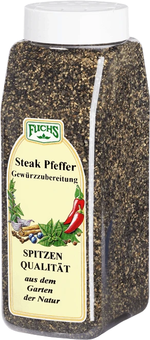 FUCHS Steak-Pfeffer Gewürzzubereitung gibt herzhaften Steaks das richtige Aroma. Einfach nach dem Grillen oder Braten von Steaks ohne zu salzen kräftig mit Steak-Pfeffer Gewürzzubereitung bestreuen. Anwendung: Nach Geschmack.