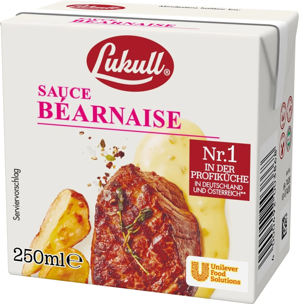 Lukull Sauce Béarnaise ist eine Buttersauce mit Kräutern, die herrlich mit Fleisch-Spezialitäten aller Art harmoniert. Die fertig angerührte Sauce müssen Sie nur kurz erwärmen und sie kann dann sofort serviert werden. Bei Bedarf bleibt die Sauce im Bain-Marie stabil und köstlich.