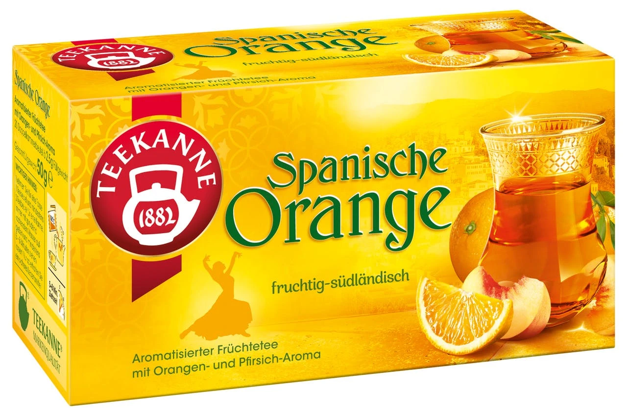 Ein Tee mit südländischem Temperament ist der Teekanne-Tee Spanische Orange. Der feine Geschmack sonnengereifter Orangen wird verfeinert mit feinem Pfirsicharoma. Sie können die Tee-Spezialität sowohl warm als auch als Eistee genießen.